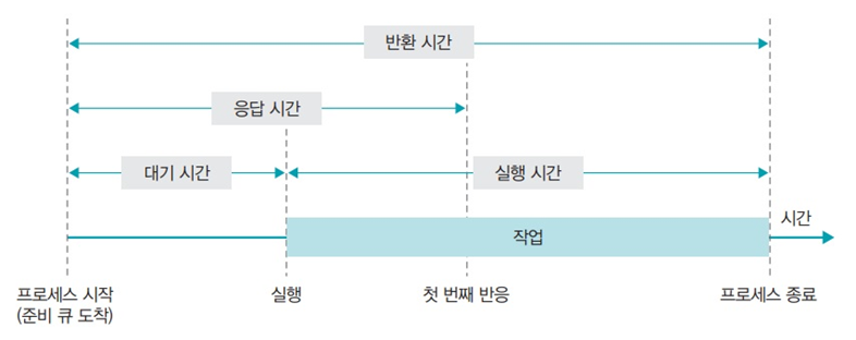응답 시간(Response time) : 프로세스가 입력되어 서비스 요청하고 반응하기 시작할 때까지의 소요시간