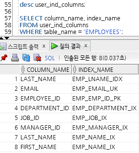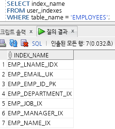 자동으로 만들어지는(PK/UK) 컬럼의 DBMS에 의해서 자동으로 만들어진 인덱스명은 제약조건명과 같다.