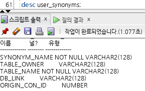 자주 쓰이는 컬럼들 (table_name, synonym_name)
