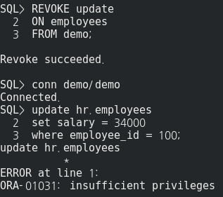 demo 사용자에 employees 테이블의 업데이트 권한을 회수해서