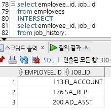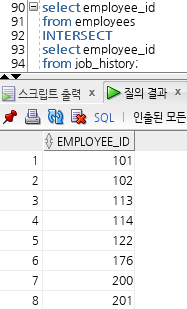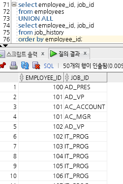 위 집합연산자가 쓰여진 쿼리문에서는 order by를 쓸 때 emp_id나 last_name을 기준으로 작성해야 한다는 뜻!