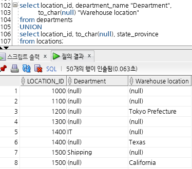 - 열이 두 테이블 중 하나에 없는 경우 TO_CHAR 함수같은 변환함수를 사용해 데이터 유형을 일치시켜도 된다.