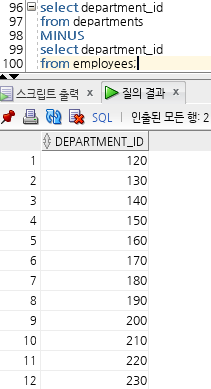 | MINUS | 첫번째 쿼리 결과에서 두번째 쿼리 결과를 뺀 부분을 출력하는 연산자 (차집합) |