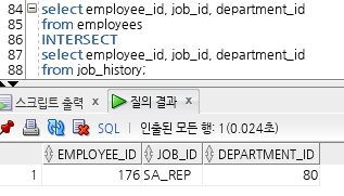 | INTERSECT | 첫번째 쿼리 결과와 두번째 쿼리 결과의 공통 부분을 출력하는 연산자 (교집합) |
